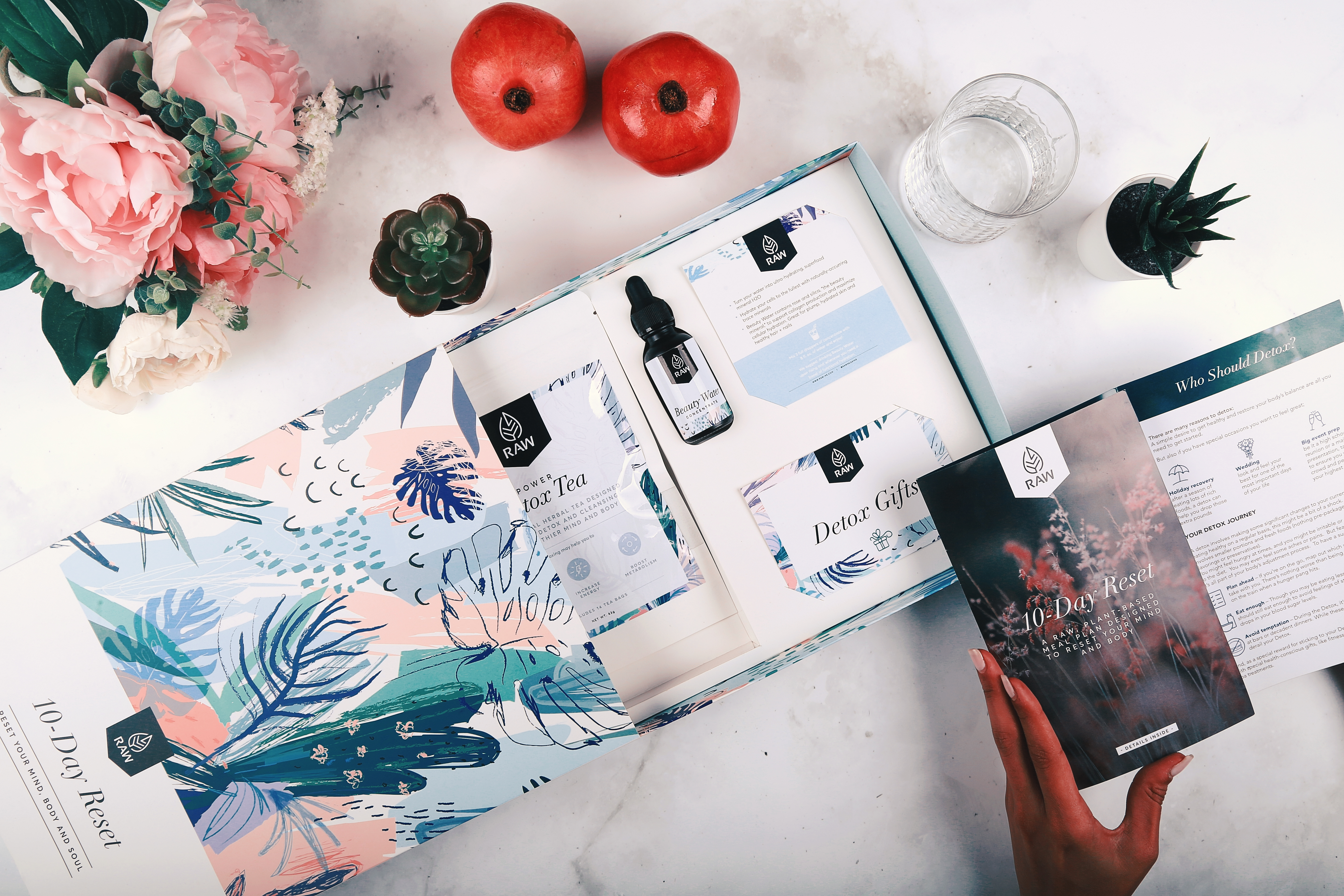 Raw ME wanted to introduce a 10-Day Reset Detox kit that housed their Power Detox Tea, Beauty Water, and Superfood Chocolate. Although some branding elements were lifted from their existing brand, a fresh pattern and a new color palette were introduced for this project alone.